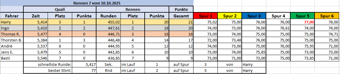 Ingo, Thorsten und Ruschi kämpften um die Plätze dahinter. Bis zum letzten Lauf war es spannend zwischen den dreien. Aber Ingo auf weiß zeigte den anderen beiden wie es geht. Fuhr von P4, mit einer Runde Rückstand, auf P2 vor. Tolle Leistung von ihm. Er hat sich nicht aus der Ruhe bringen lassen und eiskalt durchgezogen.